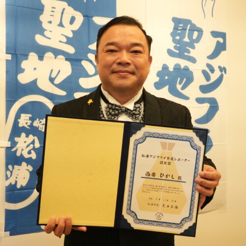 “今世紀最後の歌謡ショー司会者”西寄ひがし、長崎県松浦市「松浦アジフライ実況レポーター」に正式認定!