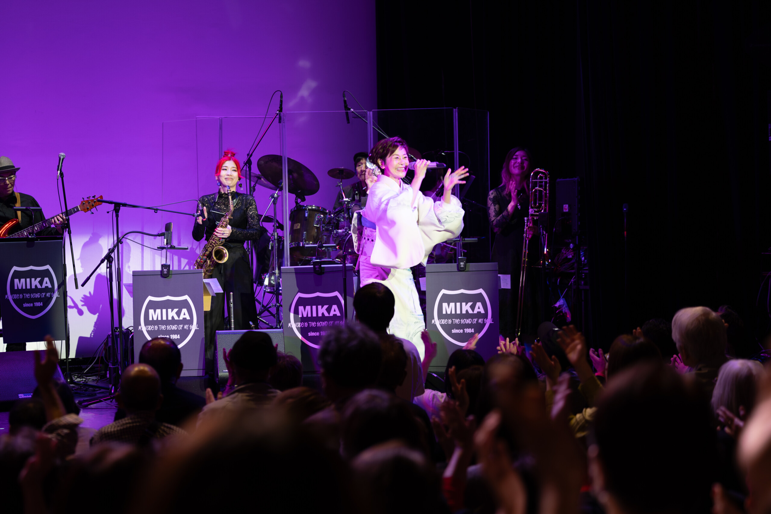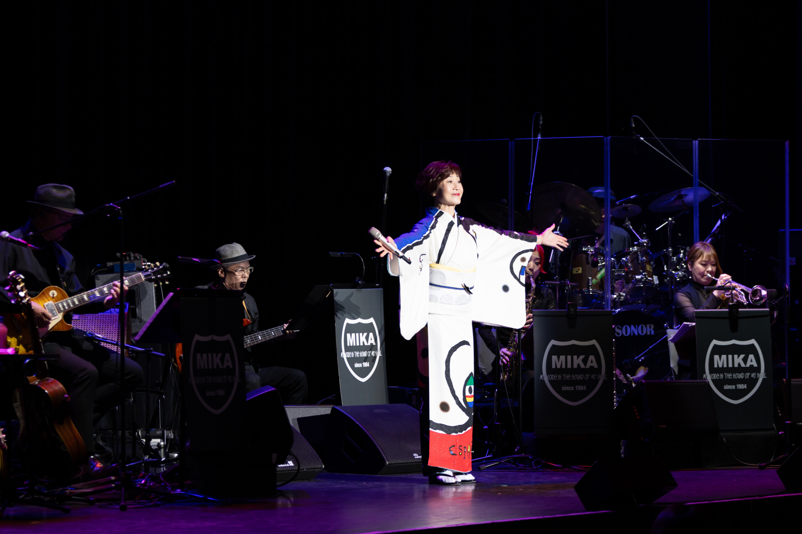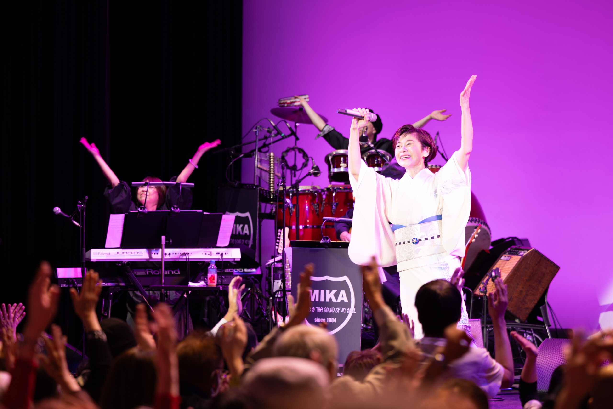 「2025年、神野美伽の演歌のコンサートはじめましょう!」と、観客へ元気よくあいさつ。昭和を代表する歌手のひとりである村田英雄の「花と竜」からスタートし、「無法松の一生~度胸千両入り」へと繋げて披露。「バレンタインチョコのお返しにこの曲の詞をいただきました」と村田との思い出を語り、生前村田本人が神野のために詞を書き下ろした秘蔵の楽曲「往生しなっせ」を歌い上げた。