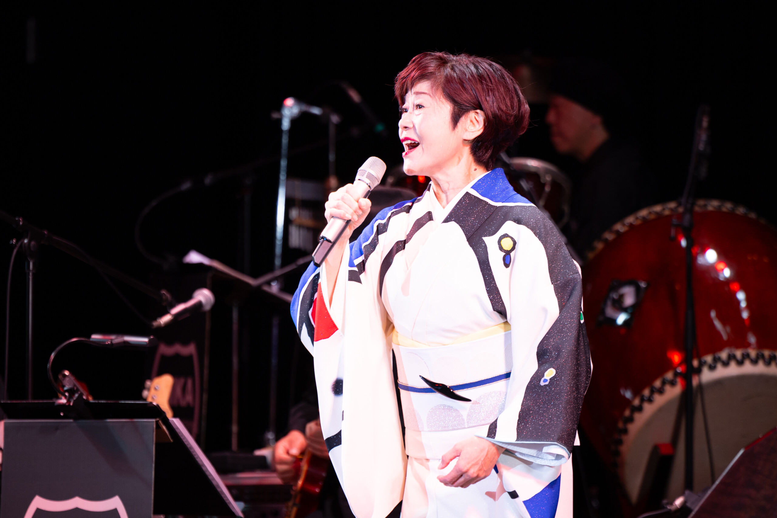 そこから間髪入れずに、「春夏秋冬屋形船」、2003年に紅白歌合戦で歌唱した「浮雲ふたり」、40周年記念曲「夜が泣いてる」を立て続けに歌い上げ、「年齢を重ねると曲への思いが変わる、年を取るのもいいね」と語った。その後、最新曲「まっぴら御免」、昨年リリースされた「天の意のまま」を続けて熱唱した。