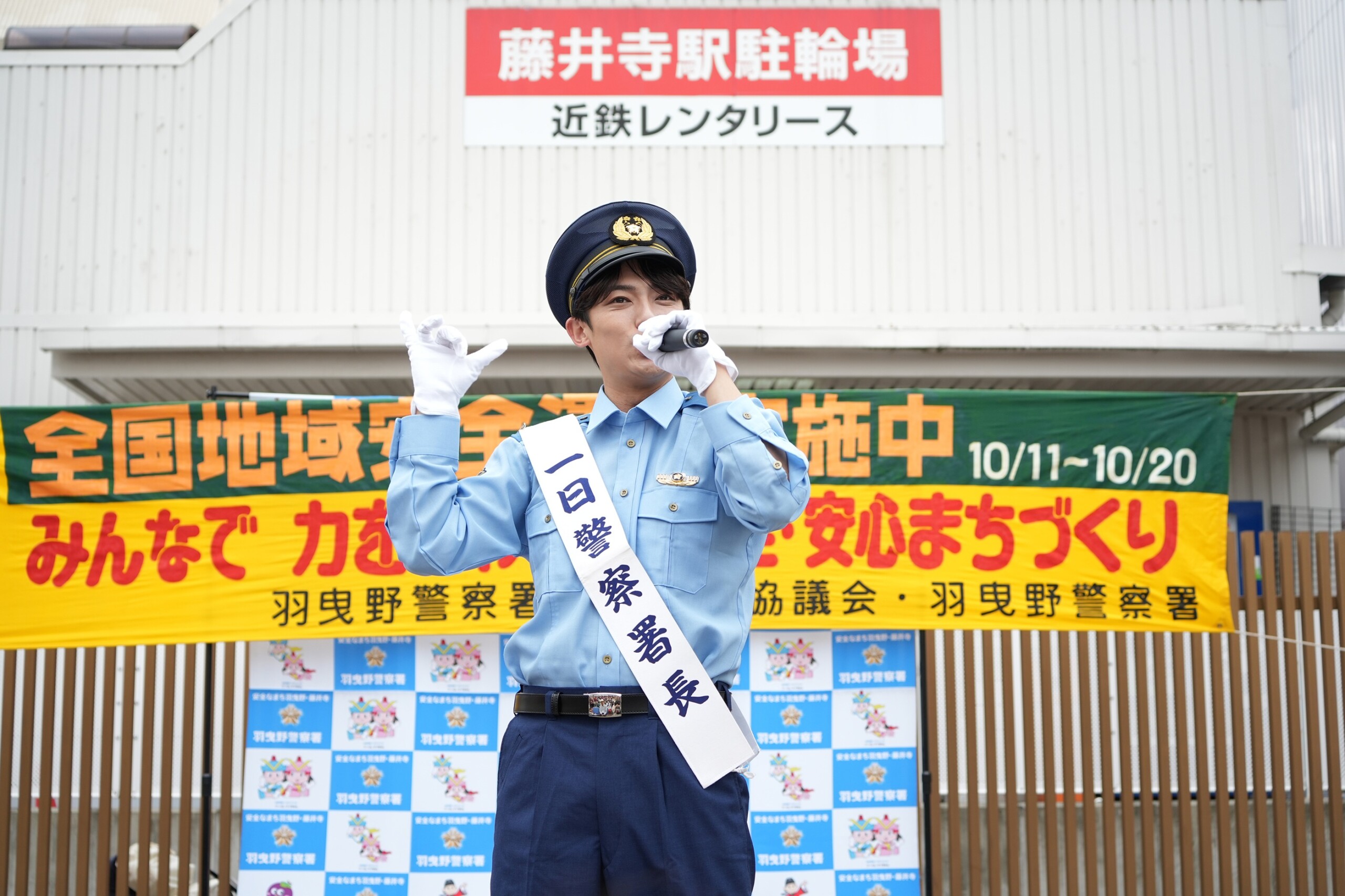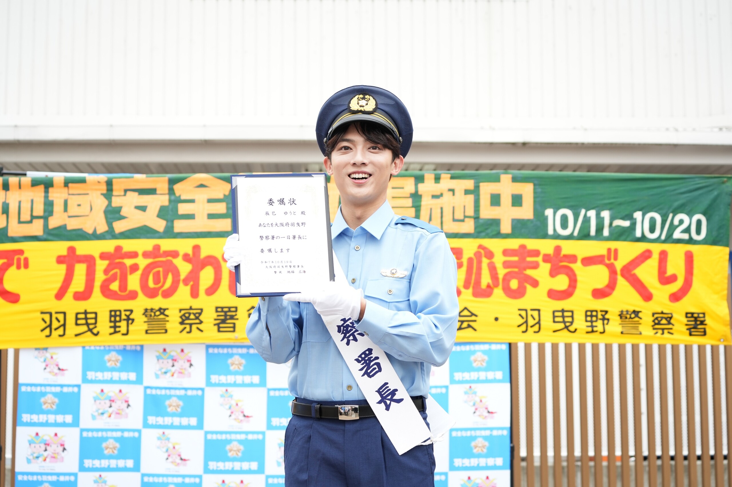 辰巳ゆうとが地元、大阪・藤井寺で一日警察署長に!防犯意識の向上を呼びかけ