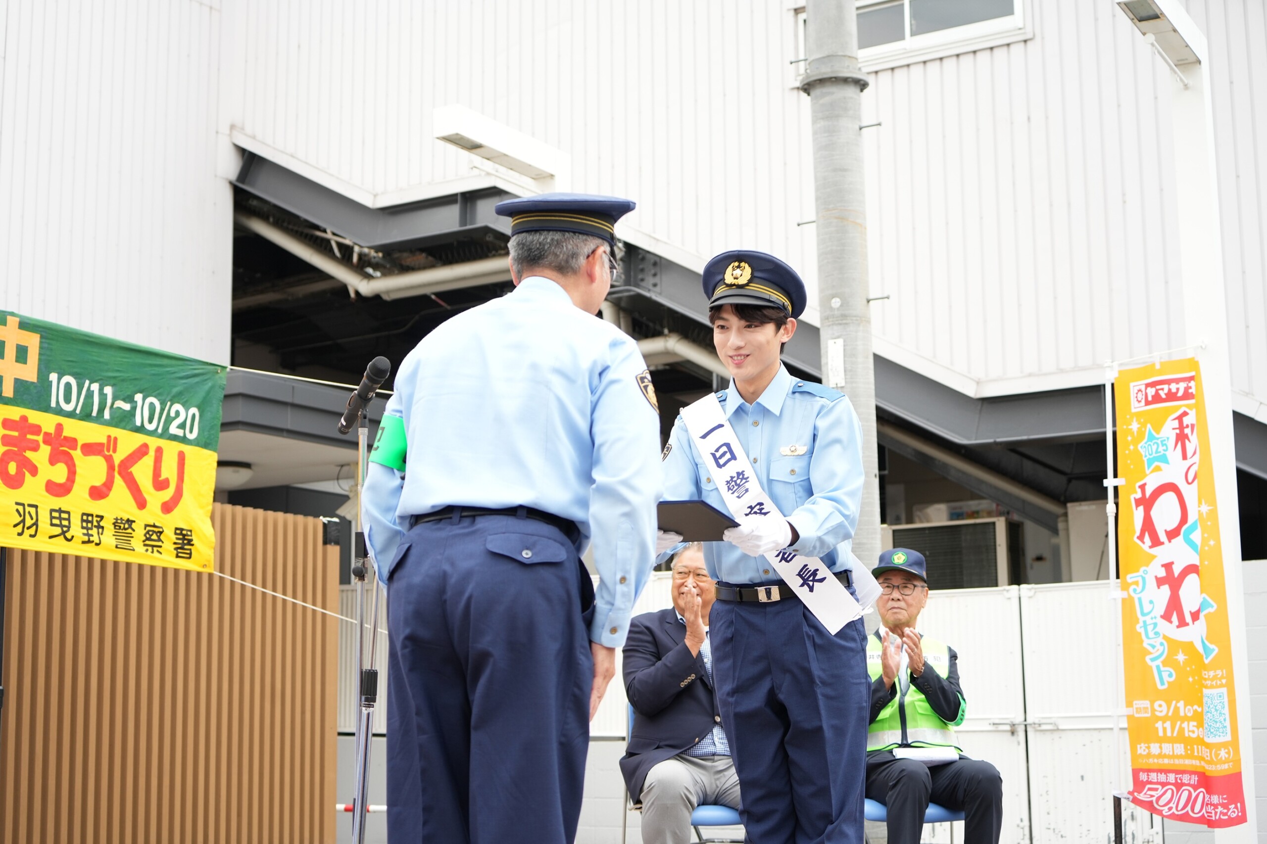 地福羽曳野警察署長から辰巳に一日警察署長を委嘱されると、「こうして地元に帰ってきて一日警察署長をさせていただけるのはありがたいこと。一人ひとりが応援してくださって、このような貴重な機会をいただけたので、今日は僕自身も楽しみながら、皆さんと安心安全とは何なのかを一緒に学んでいけたらと思います」と話した。
