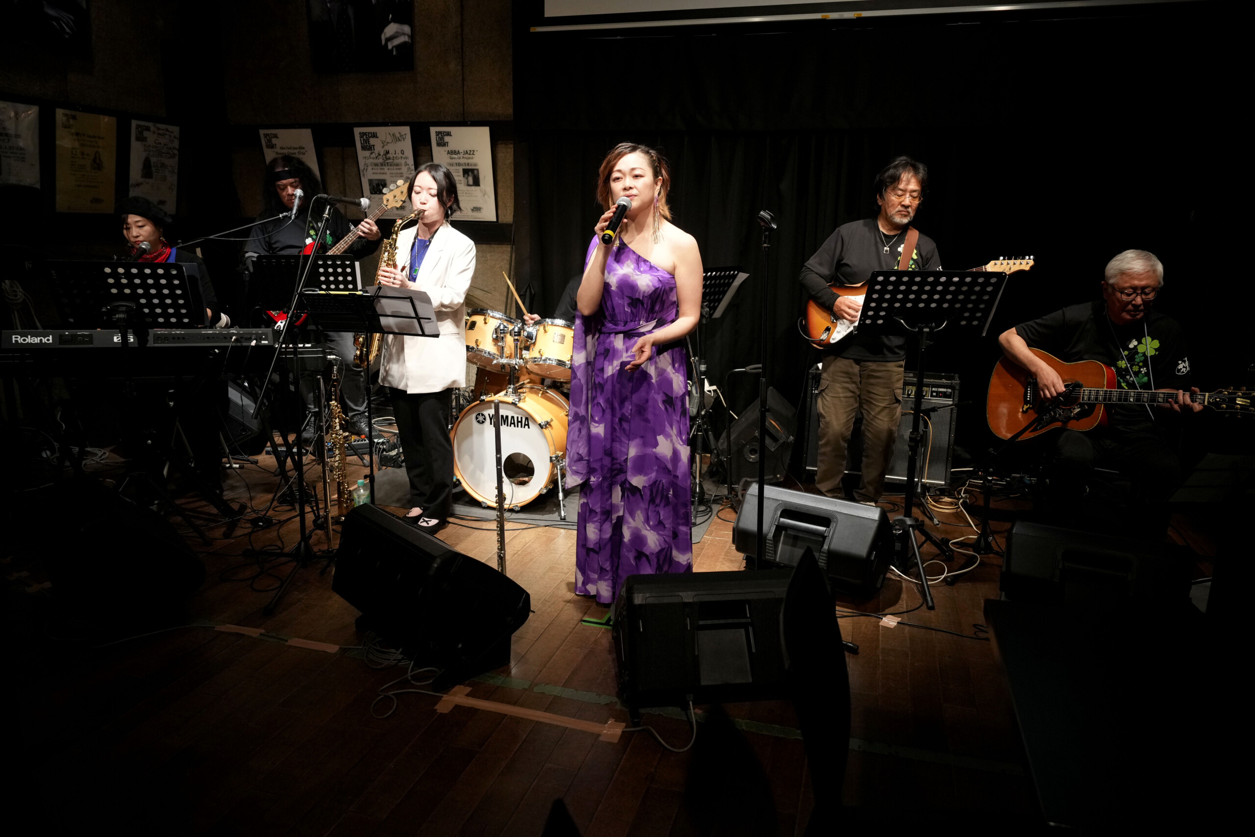 今回のライブは、バンドマスター&ベース・周防泰臣、ドラムス・永浜良邦、ピアノ・takaco、サックス・高橋美希、エレキギター・目見田則幸、アコースティックギター・柳昌之、それにボーカル&フルート・葉月みなみという7人編成のバンドで、昭和100年の間にヒットした名曲の数々を中心に選曲。