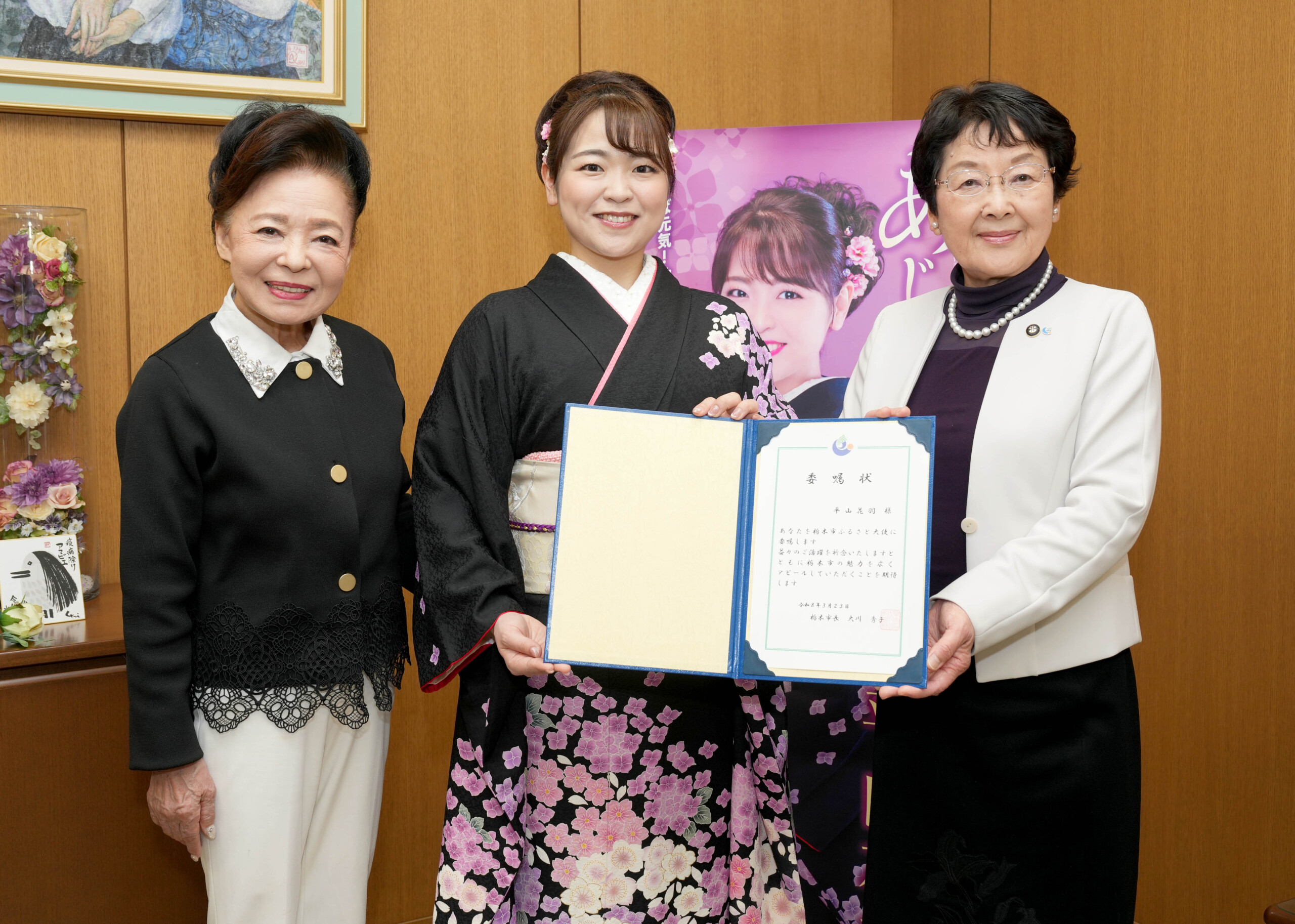 大川市長から委嘱状を手渡された平山は「大役を頂戴いたしましたこと、大変光栄に思っております。大好きな栃木市の魅力をこれから全国各地に歌を通して広げていきたい」と感激しながら「この『あじさい坂』は、栃木市にある大平山神社の〝あじさい坂〟がモチーフになっていて、カップリング曲『自慢の栃木』も栃木市にある〝黒壁〟だったり、歴史ある文化をたくさん盛り込んだ明るく楽しい楽曲に仕上がっておりますので、このデビュー曲で『私が大好きな栃木だよ』ということをたくさんの方に知っていただけるよう一生懸命、『栃木市ふるさと大使』として頑張ってまいります」と笑顔であいさつした。