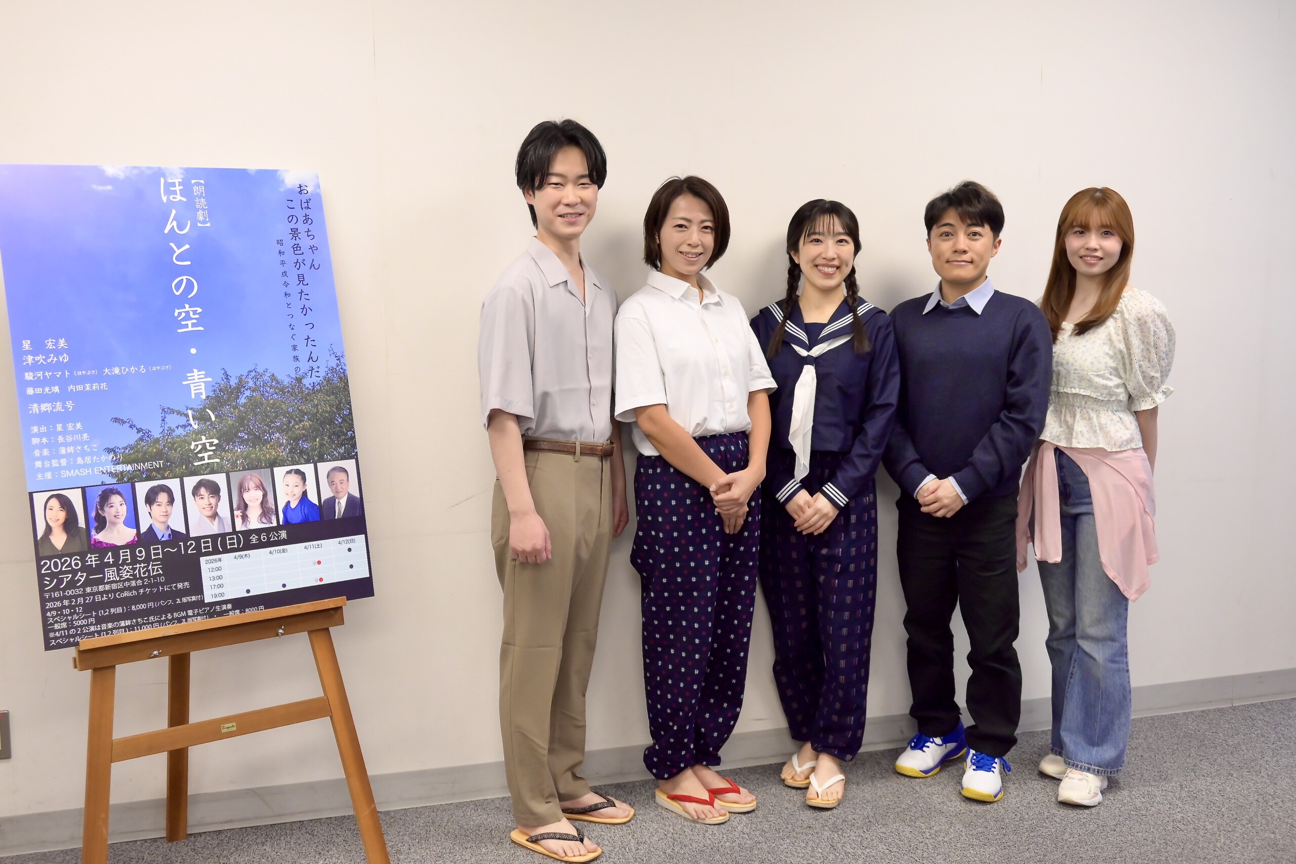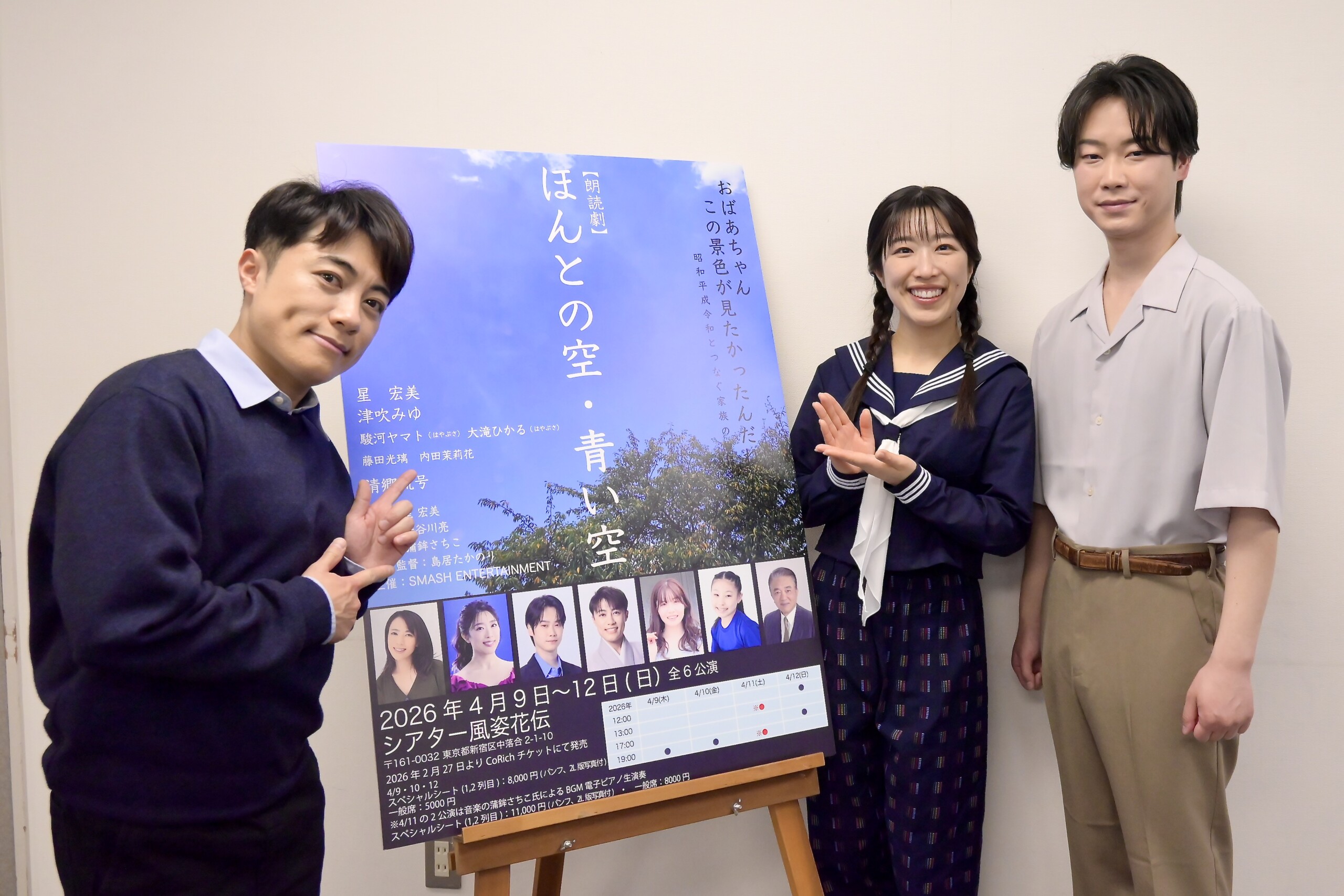 昭和・平成・令和、3つの時代をつなぐ“家族の記憶”と“命のバトン”を描く朗読劇『ほんとの空・青い空』。そのキャストの顔合わせ取材会が行われ、ダブル主演を務める星宏美、津吹みゆをはじめ、駿河ヤマト(はやぶさ)、大滝ひかる(はやぶさ)、藤田光璃らが作品への想いを語った。