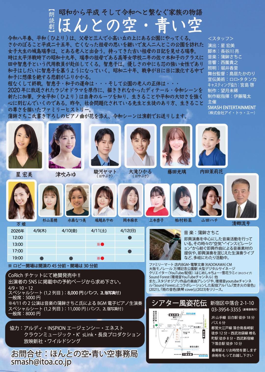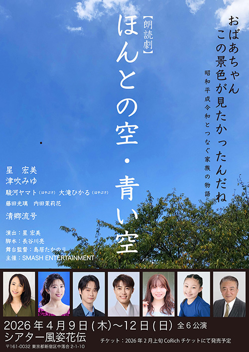 朗読劇『ほんとの空・青い空』は4月9日から12日まで、東京・新宿のシアター風姿花伝にて上演される。劇中音楽は、音楽家・蒲鉾さちこ氏によるオリジナルピアノ曲で、4月11日の2公演では劇場で蒲鉾氏が実際に本番中のBGMを全て電子ピアノで生演奏する特別演出も予定されている。